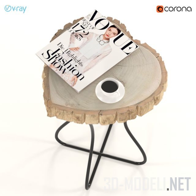Оригинальный журнальный столик со столешницей из поперечного спила дерева с толстой корой. Спил подобран в форме сердца. Основание столика создано из двух изогнутых металлических деталей. На столике – белая чашка кофе на блюдце и журнал мод.