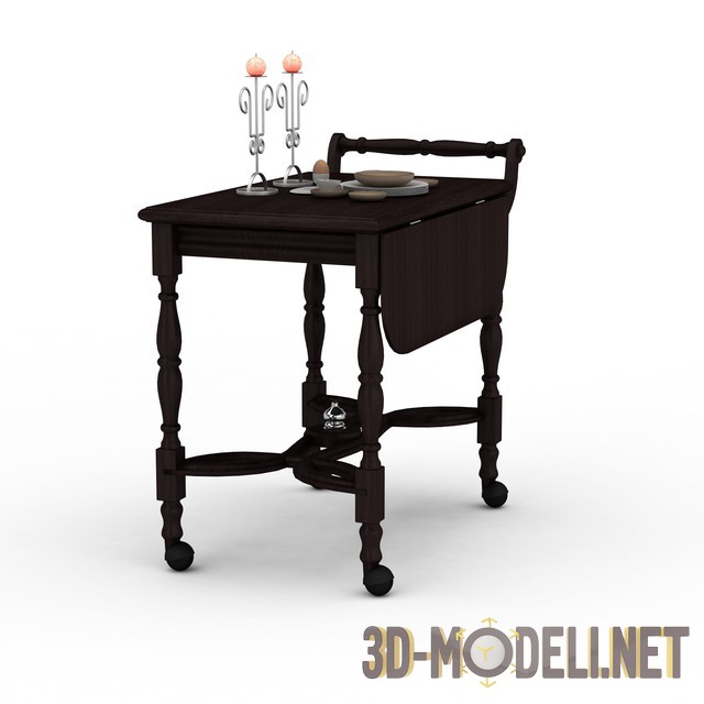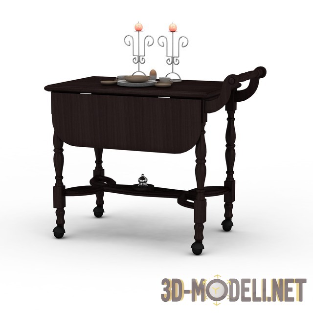 3d модель классического сервировочного столика. Деревянный столик для сервировки, на колесиках и с раздвижной столешницей, превращающей его в более удобную поверхность.