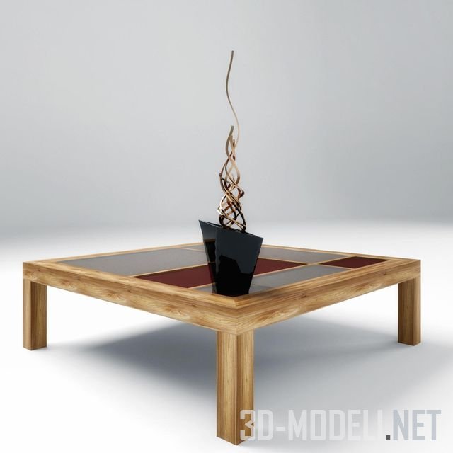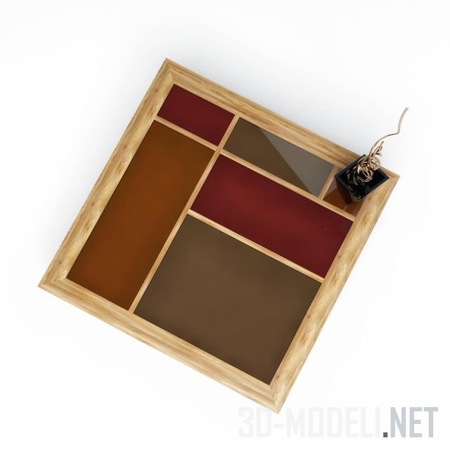 Кофейный столик с квадратной столешницей, собранной из глянцевых прямоугольников разного цвета и размера. В углу стола стоит небольшое растение в черном горшке.