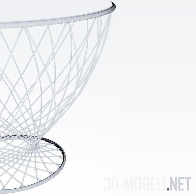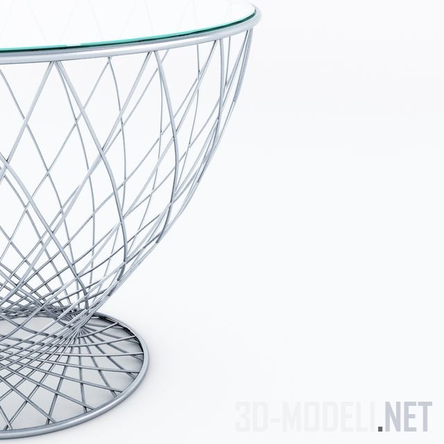 Оригинальный кофейный столик, с основанием из толстой металлической проволоки. Столик формой напоминает вазу, отличается круглой стеклянной столешницей.