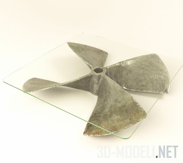 Оригинальный журнальный столик с основанием в виде больших лопастей корабельного винта и квадратной прозрачной стеклянной столешницей. Будет хорошим акцентом в интерьере в стиле лофт.