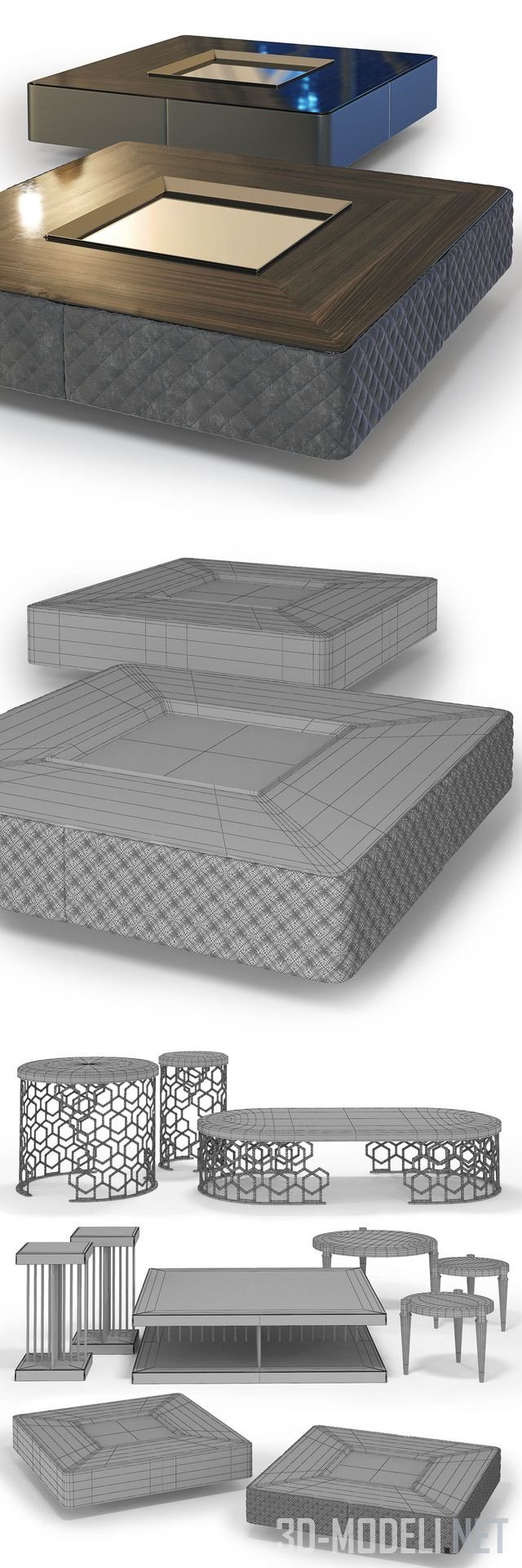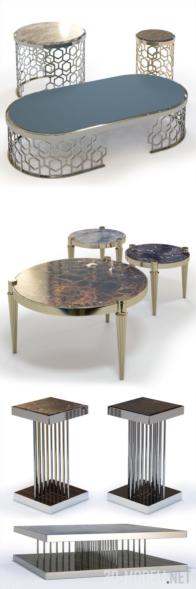 Реалистичная трехмерная модель большого набора разнообразных по размерам, материалам и формам кофейных столиков от Fratelli Longhi. В комплекте: