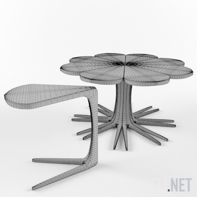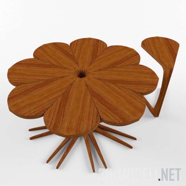 Очень милый деревянный столик рыже-коричневого цвета, с тщательно вырезанными лепестками столешницы. Стол напоминает ромашку и станет игривым дополнением интерьера.