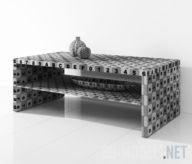 Низкий прямоугольный стол от Bero, изготовлен из светло-коричневого дерева. Модель с вазой на столешнице.