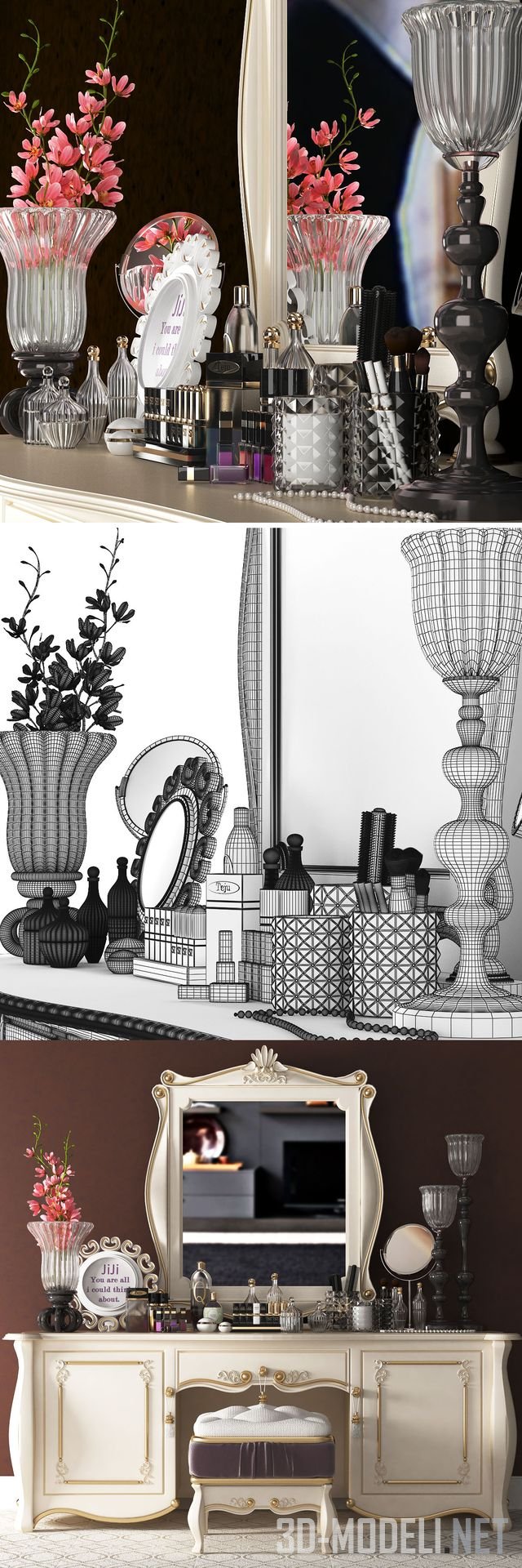 Детально проработанная, высококачественная модель туалетного столика в классическом стиле. Столик дополнен всеми необходимыми элементами и аксессуарами: это пуфик, зеркало, косметика, предметы декора (ваза с цветами, фото в изящной раме, свечи и пр.)