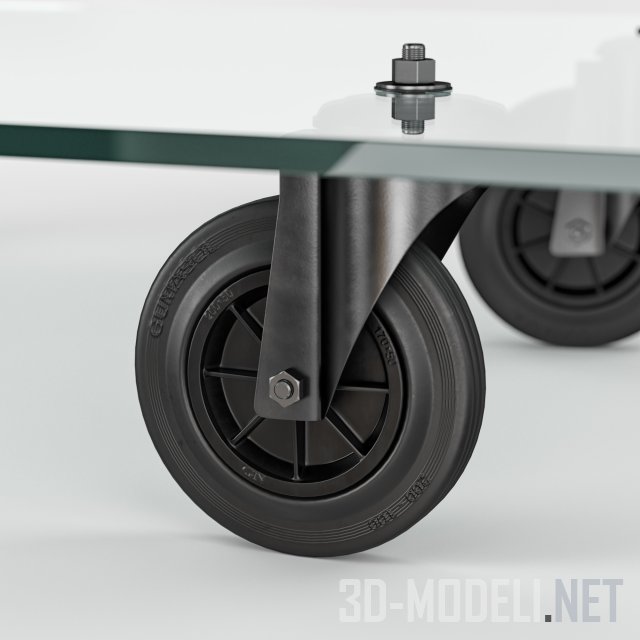 Кофейный стол на колесах, разработанный в 1980 году дизайнером Gae Aulenti для бренда FontanaArte. Материалы изготовления: стекло толщиной 15 мм, которое отлично сочетается с промышленного вида колесами. Размеры стола: 120 х 120 см, высота 25 см.