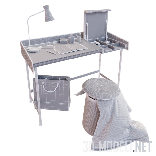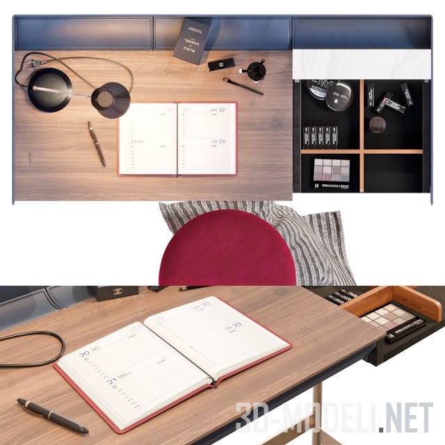 Рабочий стол Secret от Bontempi Casa. Стоол с лакированным металлическим бортом по трем сторонам и небольшим хранилищем, совпадающем с внешним краем, деревянным верхом, откидной крышкой для секретного отделения из лакированного дерева или Supermarble. Размеры стола: 112 x 50 x 76/85. Возле стола стоит высокий красный пуф с открывающимся сиденьем, из-под которого торчит плотный полосатый кусок ткани.