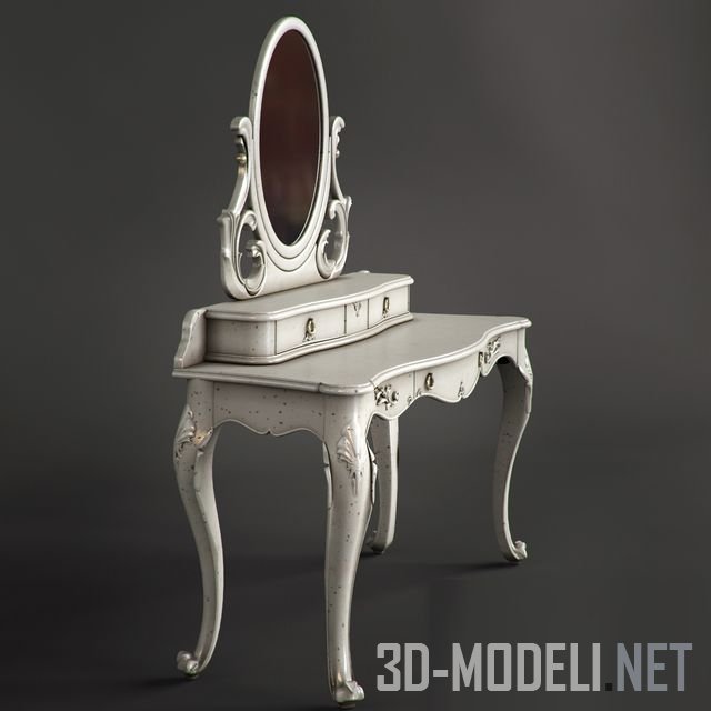 Косметический столик с зеркалом Habersham Michelle, в стиле барокко. Типичные для стиля изгибы ножек и резьба в отделке дополнены белым состаренным лаком с легким патинированием в резных элементах. Овальное зеркало украшено резной рамой.