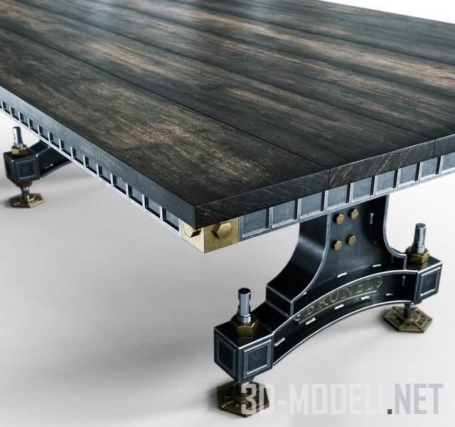 Стильный стол BRUNEL, изготовлен вручную из таких элементов, как листовая сталь толщиной 10 мм, регулируемые ножки из фрезерованной стали M36, прочные латунные крепления, литые латунные значки. Верхняя часть делается из массива дуба или ореха. Все тщательно отполировано вручную и покрыто порошковой краской.