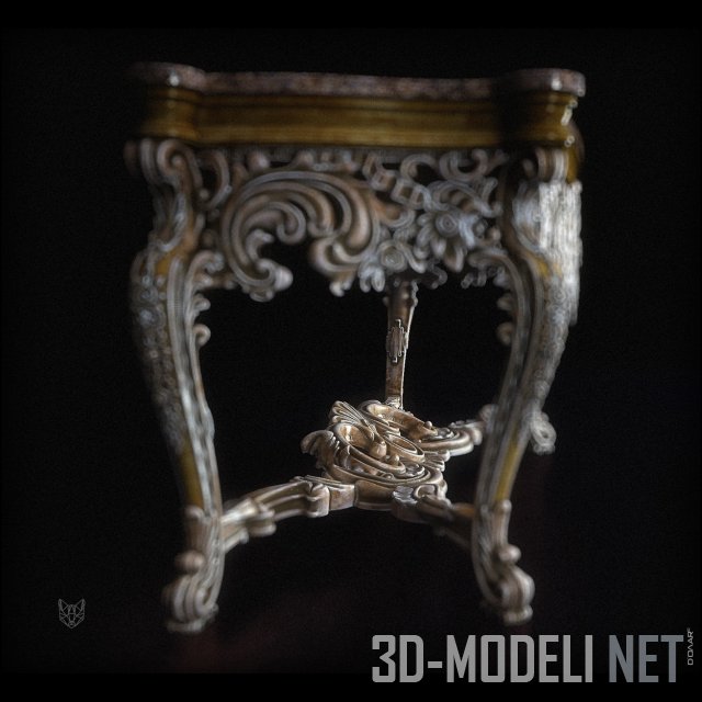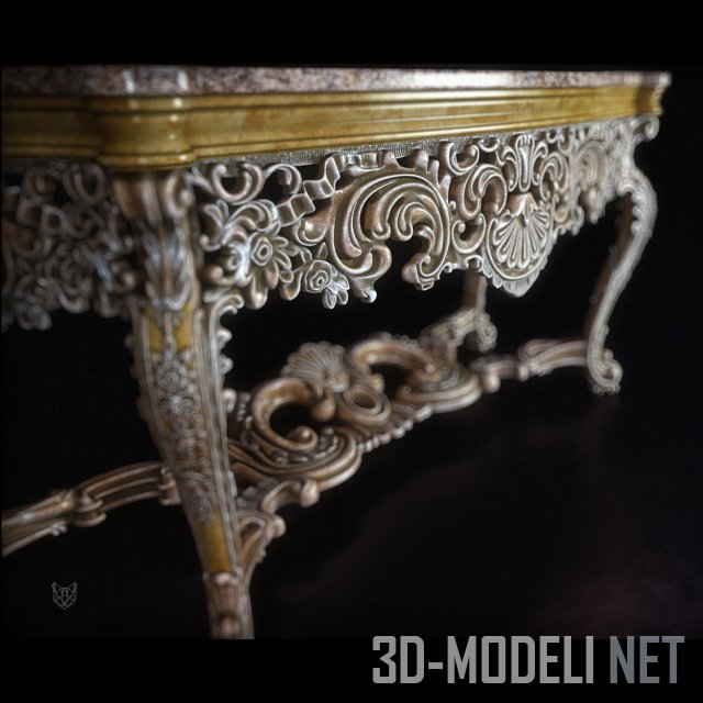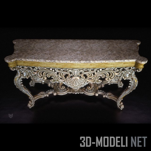 Шикарный консольный столик Jumbo Console для интерьера в классическом стиле. Столик имеет мраморную прямоугольную столешницу с закругленными углами, гнутые, украшенные резьбой ножки, соединенные между собой очень красивыми резными элементами внизу и вверху, цвета патинированной бронзы.
