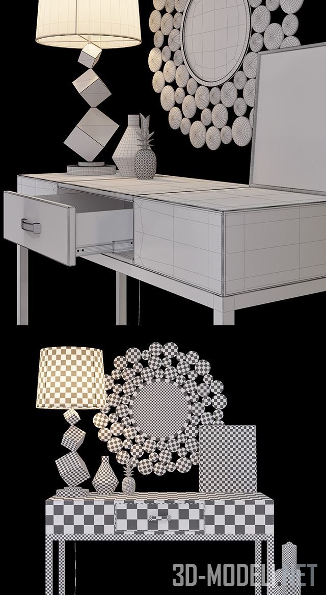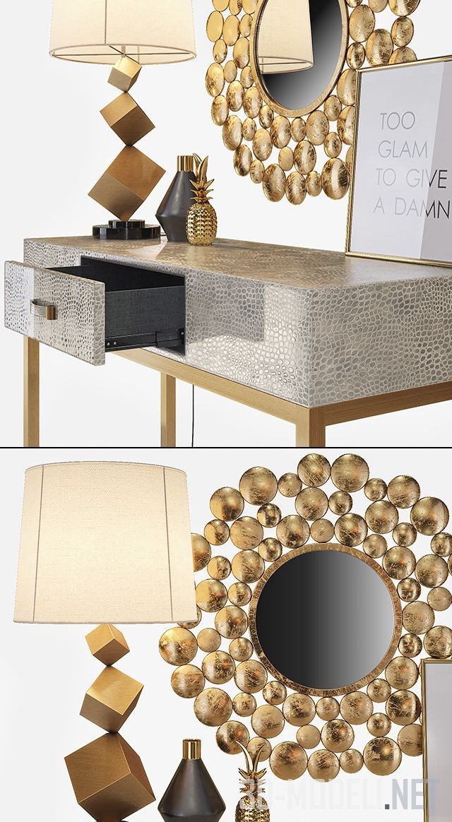 Очень реалистичная 3d модель консольного столика Out There Interiors. Столик стоит на золотых прямоугольных ножках-салазках. Его фасад изготовлен из искусственной кожи страуса. Размеры стола: В78 x Ш120 x Г45см. На столешнице предметы Out There Interiors: настольная лампа Cuyler, черная ваза Ananya, декоративный ананас золотого цвета и круглое зеркало Gaby на стене.