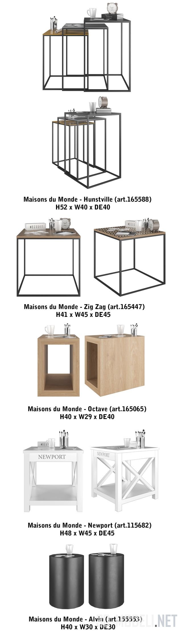 Набор интерьерных журнальных столиков от бренда Maisons du Monde. В сцене присутствует декор для украшения столов. Каждый стол назван в соответствии с его артикулом.