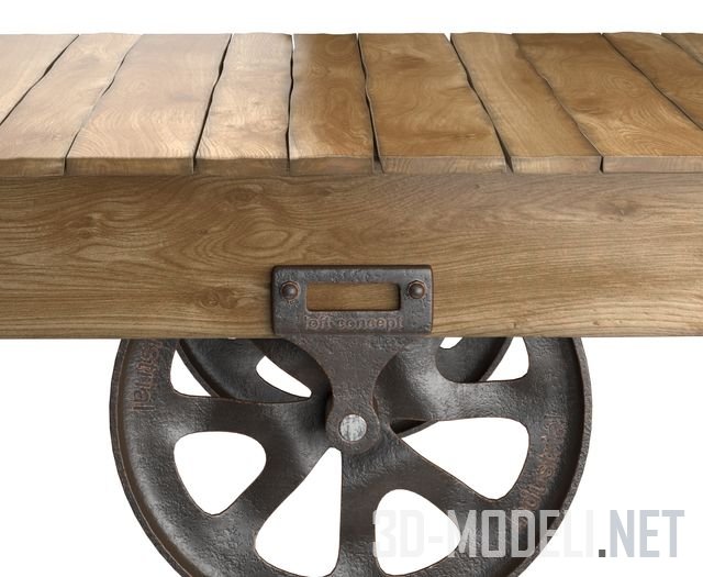 Реалистичная модель FACTORY CART COFFEE TABLE от Loft concept, кофейный столик-тележка на колесиках. Материалы изготовления: чугун, дерево. Артикул: 18.002.RU.30.LOFT. Размеры стола: 135 х 65 х 45 см. Этот предмет винтажной мебели внесет характерную индустриальную нотку в интерьер.