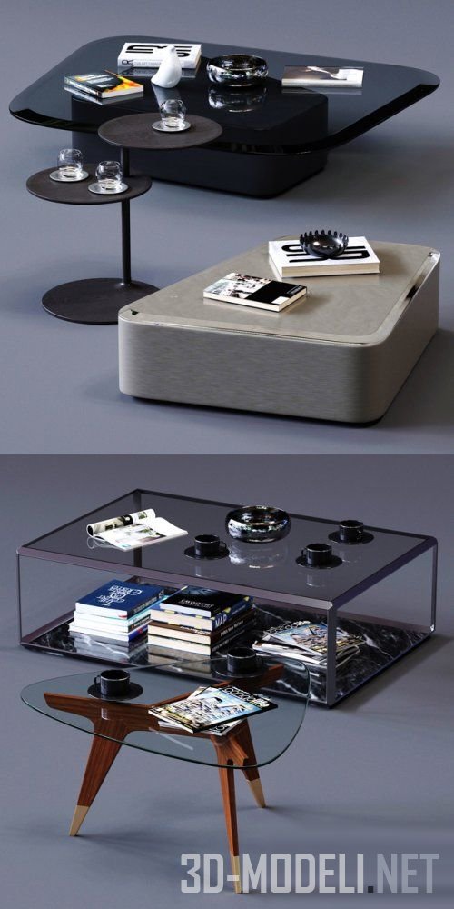 Набор квадратных и круглых, с полками и без, а также с различными предметами (книгами, пепельницей, кофейными чашками и пр.) стеклянных кофейных столиков итальянского производства. Можно использовать любой из столов как полноценный интерьерный объект. Трехмерная копия выполнена в соответствии с оригинальным продуктом.