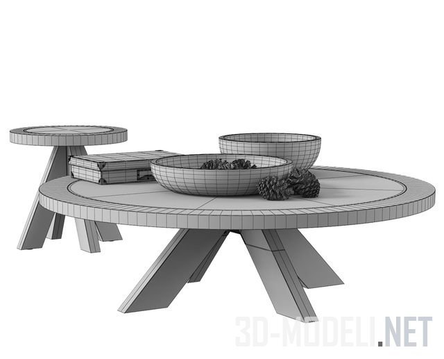 Французский круглый стол X-Base 1960-х годов от Restoration Hardware. Стол сделан из массива дерева светло-коричневого цвета. На столешнице стоят каменные чаши с крупными сосновыми шишками и белая плоская коробка с коваными латунными уголками.