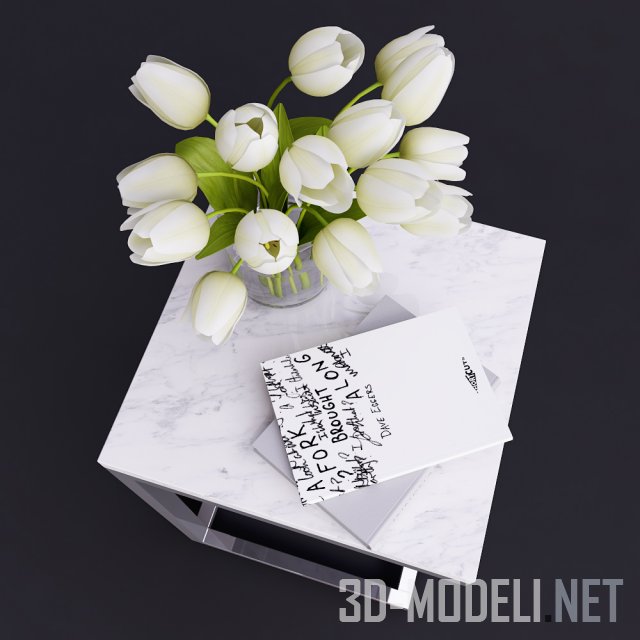 Приставной элегантный столик от производителя Pottery Barn, модель Bryn Marble Top C. Столик дополнен интерьерными аксессуарами – это ваза с белыми тюльпанами и книги.
