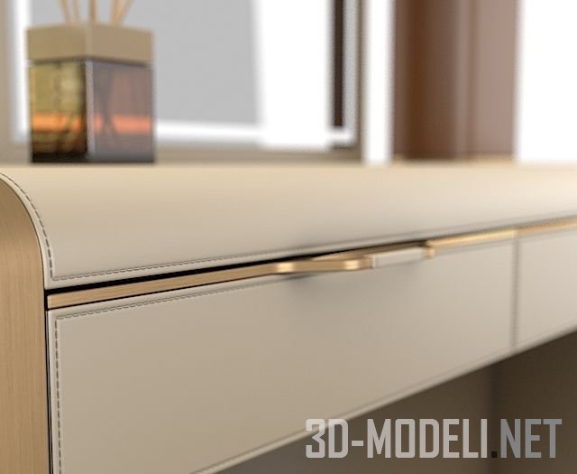Элегантный, обтянутый бежевой кожей туалетный столик Capri (Art.1507) от производителя Ludovica Mascheroniс. Столик имеет ножки и ручки из бронзированной латуни. Внутренний объем выдвижных ящиков обтянут нубуком. На столешнице закреплено прямоугольное зеркало с подсветкой, с обтянутой кожей рамкой и телескопическим механизмом. Справа от зеркала стоит настольная лампа с шоколадным основанием и латунным абажуром. Возле столика стоит обтянутый кожей пуф.