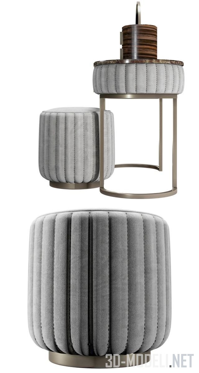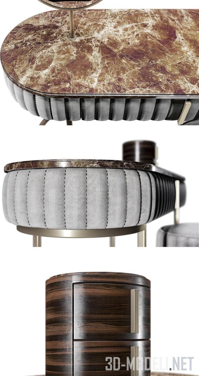 Оригинальный косметический столик Signorini Coco Daytona Rimmel и круглый пуф, отделанные по бокам мягкими стегаными элементами из серого текстиля. Овальная столешница из коричневого мрамора. На столешнице круглое зеркало и деревянная шкатулка.