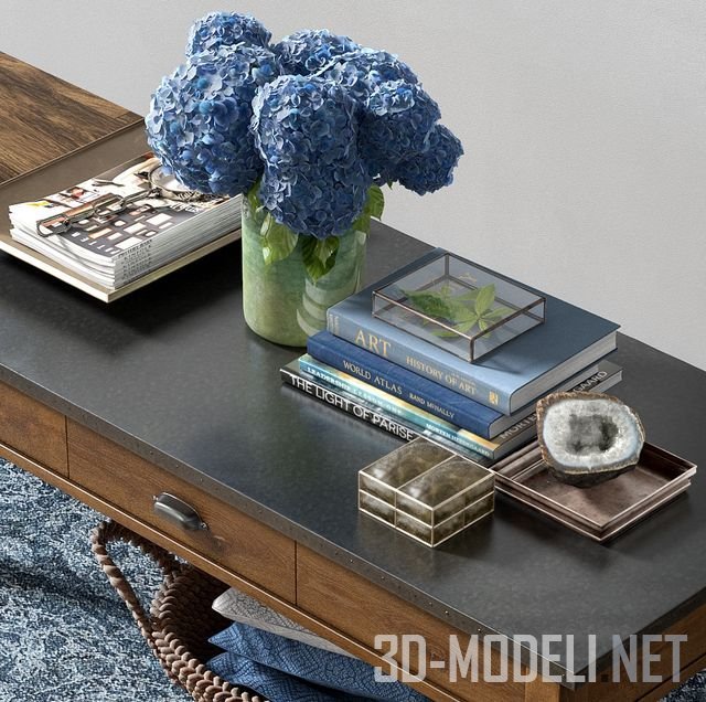 Небольшой столик в этно-стиле CHANNING COFFEE TABLE от Pottery Barn (размер стола 142,24 х 66 х 45,72 см) на синем шерстяном коврике BOSWORTH (97,5 х 180 см). На столе зеленая ваза с голубой гортензией, книги, журналы, квадратное блюдо, шкатулки и коробки. Под столом низкая плетеная корзина с небольшими декоративными подушками.