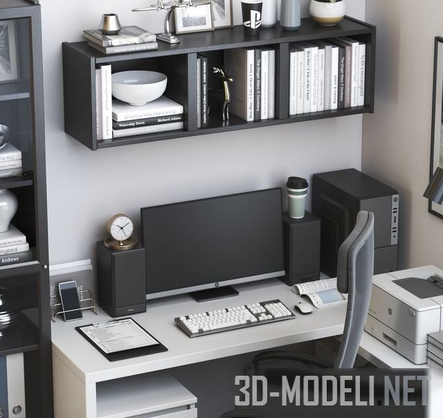Оборудовать удобную рабочую зону можно с помощью предметов мебели и декора от бренда IKEA. В основе сета письменный стол MALM с выдвижной панелью. Стол белого цвета, размер 51 x 65 см, комод с двумя ящиками, серия MALM. Комод также белый (габарит 40 x 55 см). Рабочий стул MARKUS темно-серый, хорошо сочетается с темными предметами обстановки. Это черно-коричневый со стеклянной дверцей книжный шкаф BILLY/OXBERG размер шкафа 40 x 30 x 202 см, настенная полка BILLY (черно-коричневая, размер полки 120 x 35 см), торшер NYMANE цвета антрацит и постер в черной раме FISKBO. Размер рамы: 50x70 см.