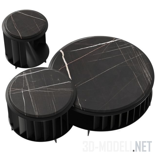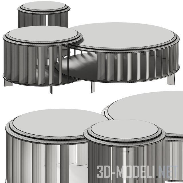 Кофейные столики из коллекции Islands. Дизайн разработал Stephen Burks для фабрики Living Divani. Набор содержит столы трех разных высот и диаметров (470 х 470 х 465, 60 х 660 х 415 и 1040 х 1040 х 365). Столы доступны по всему периметру благодаря серии поворотных планок.