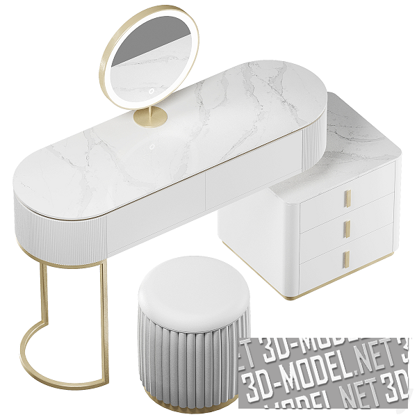 Белый с золотистым комплект от Frandiss из пуфа и косметического столика с овальной столешницей, тумбой и выдвижными ящиками. На столике - круглое зеркало с подсветкой по периметру, в золотистой тонкой рамке на круглой подставке. Овальная столешница и верхняя плоскость тумбы - белый с серыми прожилками мрамор. Корпуса и фасады - белый гладкий МДФ. Овальные части корпуса стола декорированы вертикальной гофрой, что гармонично перекликается с декором вертикальной поверхности цилиндрического пуфа. Он декорирован вертикальными мягкими элементами с белой кожаной обивкой (как и круглое сиденье пуфа). Цоколи мебели, ножки стола и ручки на фасадах выдвижных ящиков тумбы - матовые, золотистые. Габарит стола: 120х40х75см. Габарит интегрированной тумбы: 50х45х45см. Пуф: 38х38х42см.