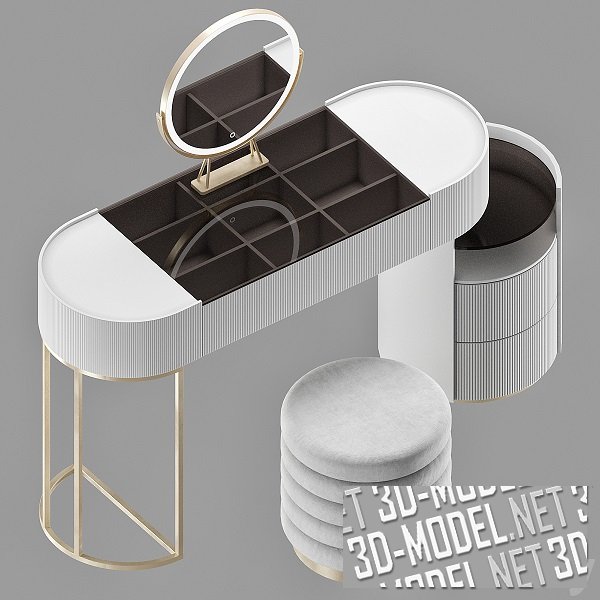 Белый с золотистыми металлическими элементами косметический столик с овальной поверхностью, интегрированной круглой тумбой, круглое настольное зеркало и цилиндрический мягкий пуф со светло-серой обивкой. Пуф выполнен в виде пяти плоских мягких «таблеток» на золотистом цоколе. Прямоугольная часть столешницы изготовлена из черного полупрозрачного стекла. Под ним просматриваются перегородки ячеек в объеме выдвижного ящика. Полукруглые части столешницы по бокам - белые, с невысоким бортиком. Боковые плоскости овального корпуса стола и фасад выдвижного ящика отделаны гофрированным материалом с узкой вертикальной фрезеровкой. Такая же отделка и у фасадов двух выдвижных ящиков на тумбе. Верхняя круглая плоскость тумбы - черное стекло. Габарит столика: 120х42х75см. Габарит зеркала на золотистой подставке - 43х52см.