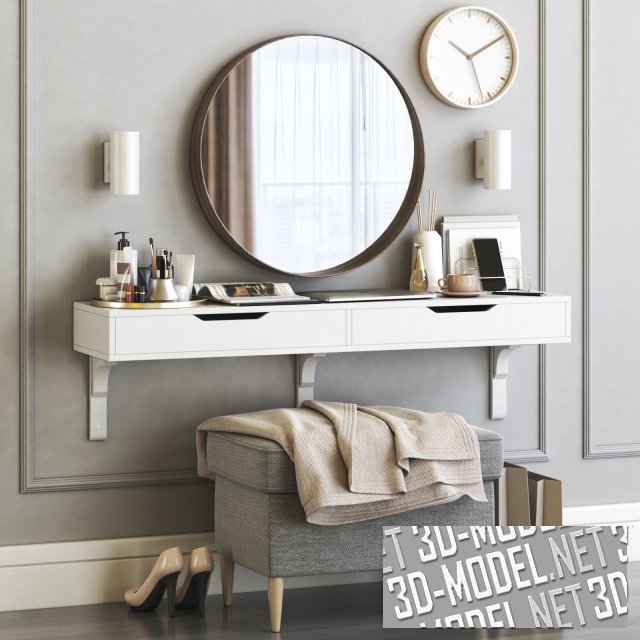 Современный «женский уголок» от IKEA с белой консольной полкой EKBY ALEX (119х29см), с парой выдвижных ящиков и тремя консольными крепежами (RAMSHULT Console, 18x22см). Над столиком - большое круглое зеркало (STOCKHOLM, d60см) в плоской, глубокой рамке и небольшие круглые настенные часы в белой окантовке (SKARIG, d26см). Пара белых цилиндрических бра (NYMANE Sconce) разместились слева и справа от зеркала. На полке: поднос с косметикой, журнал, органайзер со смартфоном и папками, парфюм, керамика. На полу, под консолью - прямоугольная оттоманка (STRANDMON) с мягкой серо-меланжевой обивкой корпуса на деревянных ножках. На пуфе - бежевый плед, пара вечерних женских туфель нежно-бежевого цвета, пара бумажных пакетов.