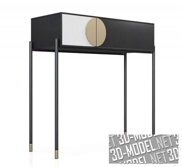 Современный консольный столик на длинных тонких ножках с золотистыми наконечниками. На фронтальной части с небольшим выдвижным ящиком слева и ящиком подлиннее справа размещены две полукруглые золотистые ручки от Kulagio, соединяющиеся в круг. Меньший фасад ящика декорирован вертикальной фрезеровкой. Правый фасад - гладкий. Габарит стола: 95х40х100см. Представлены два варианта декора: черный корпус и ножки, левый фрезерованный фасад - черный, правый (гладкий) - бледно бежевый. Второй вариант: Черный корпус и ножки с правым черным гладким фасадом и с фрезерованным малым - белого цвета.
