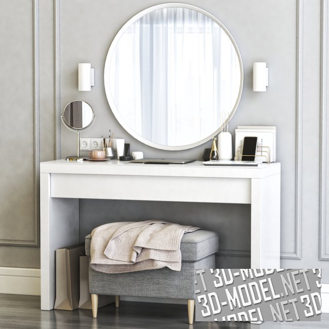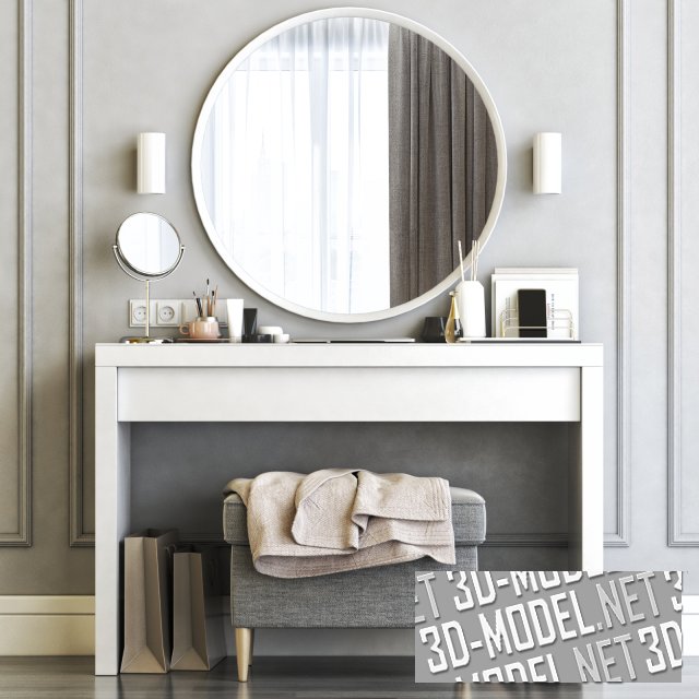 Комплект мебели для обустройства уголка красоты в комнате. В основе набора туалетный столик MALM из IKEA с круглым зеркалом LANGESUND. Мебель дополняет настольное зеркало TRENSUM из нержавеющей стали, темно-серая оттоманка STRANDMON, белого цвета настенный светильник NYMANE. Бра расположены симметрично, это создает гармоничную композицию. Сет дополняют различные аксессуары - предметы декора, обувь, пакеты и пр., что делает эту высококачественную трехмерную модель очень реалистичной.