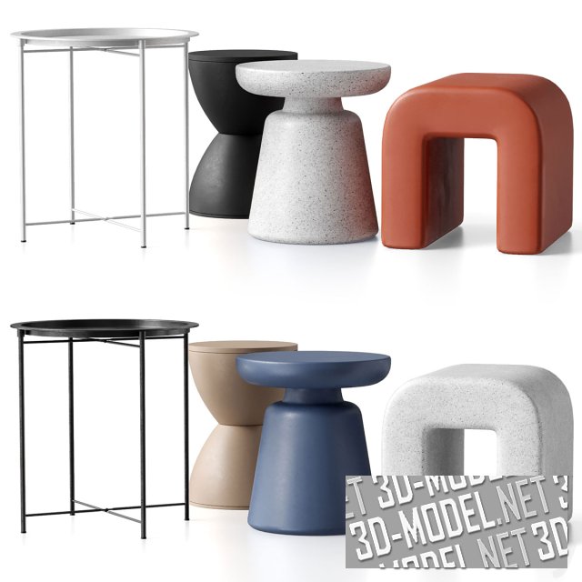 Четыре вида кофейных столиков в современном стиле: Glad (d47\h51см), Tony (d30\h43см), Reparks (40х45х40см), Lily (d39\h43см). Столик Glad - круглая, блюдообразная столешница на тонком металлическом каркасе с четырьмя ножками, в двух цветах (белый, черный). Столик Tony - цельнотельный, напоминает катушку из двух скругленных усеченных конусов, в двух цветах (черный матовый и бежевый). П-образный литой Reparks представлен в пяти декорах (бледный ультрамарин, белый, терракот, карамель (охра), белый с мелкими черными вкраплениями). Lily - цельнолитой, пластиковый, с круглой столешницей и мощной опорой в виде усеченного конуса, в пяти декорах (бледный ультрамарин, терракот, карамель, черный матовый, белый с черными крапинками).