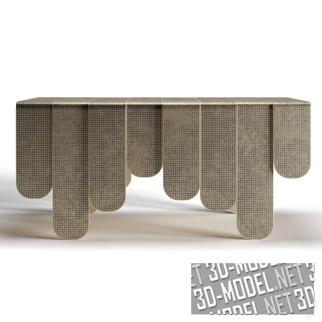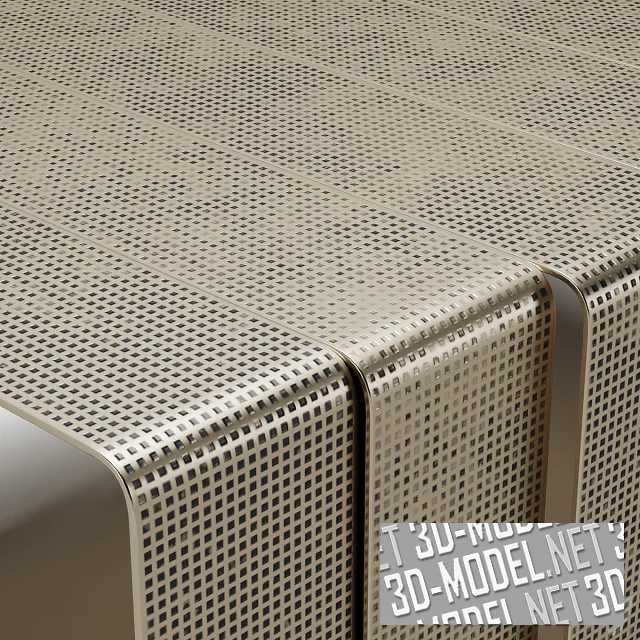 Современный кофейный столик XILO от DE CASTELLI (дизайн: DelineoDesign). Состоит из нескольких П-образных латунных изогнутых пластин с закругленными торцами. Разная длина пластин и рельефная верхняя плоскость, напоминающая квадратную перфорацию, создают интересный интерьерный объект.