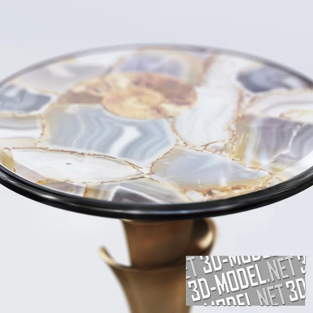 Изящный круглый столик Kenaz от IPE Cavalli (Visionnaire) на фигурной латунной ножке в стиле арт-деко. Ножка с круглой площадкой и «завитая» в верхней части. Круглая столешница выполнена из полированных кусков камня с разрезанным окаменелым аммонитом. Диаметр столешницы 48см. Высота стола 64см.