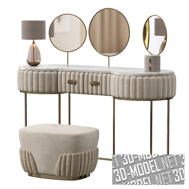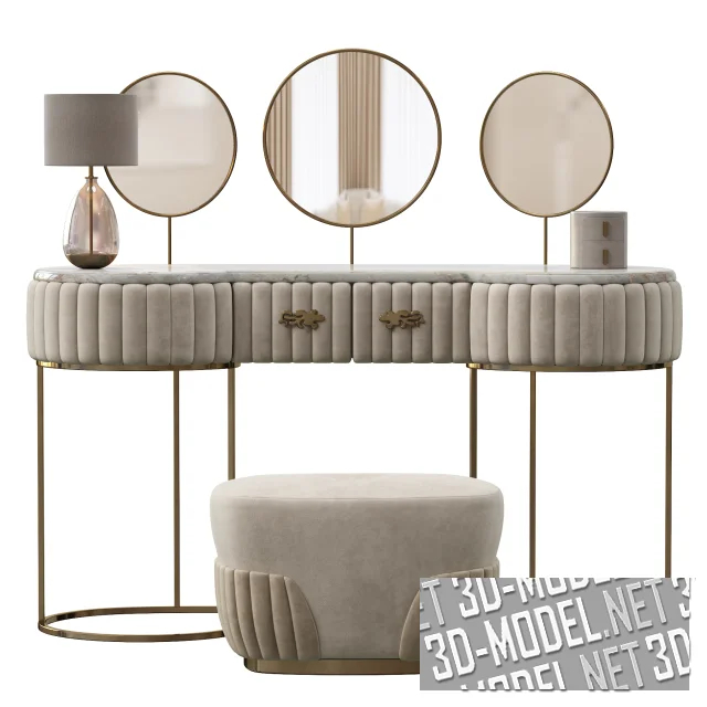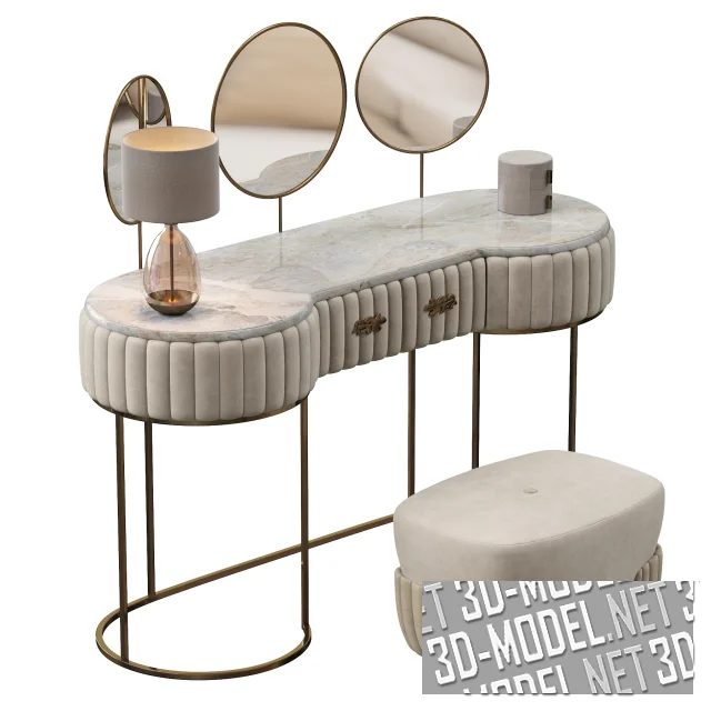 Криволинейный скругленный корпус стола со столешницей из белого с серым мрамора имеет два небольших выдвижных ящика с золотистыми фигурными ручками и декор в виде мягких вертикальных элементов по боковым плоскостям. Такие же мягкие элементы декорируют и часть пуфа. Обивка - цвета слоновой кости. Опора стола, выполненная в виде каркаса, и цоколь пуфа изготовлены из золотистого металла. На задней кромке столешницы смонтированы три круглых зеркала в тонких золотистых рамках разного диаметра на тонких ножках. Габарит стола: 73х135х58см. Габарит пуфа: 38х58х38см.
