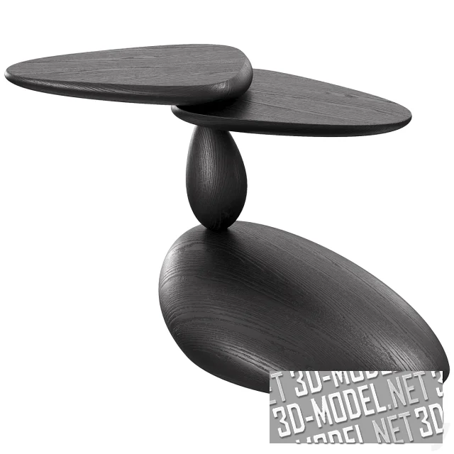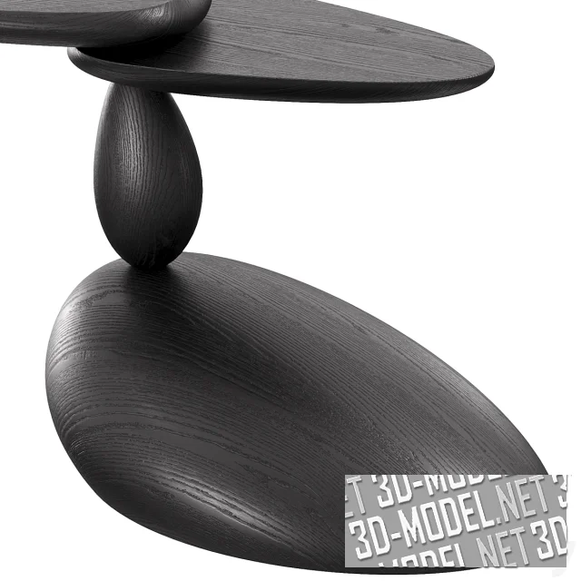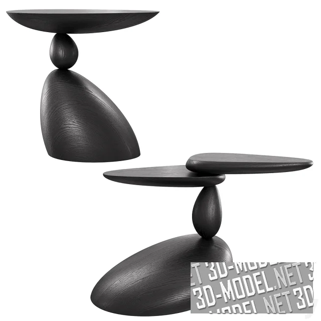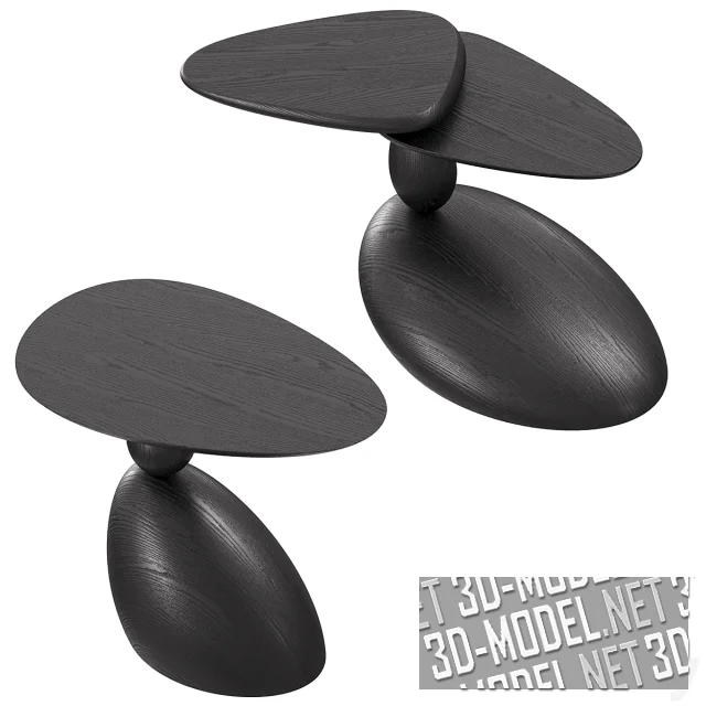 Черные журнальные столики из массива дуба - Stones и Twins от WOODZENART из коллекции Stone Story. Элементы выполнены в виде гладких объемных тел, напоминающих формой гладкие морские камни. Криволинейные столешницы закреплены на оси, проходящей сквозь опоры к подставками, позволяют менять положение столешниц относительно оси. Габариты столов: 55х44х60см и 41х83х59см.