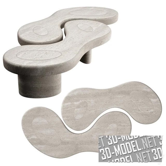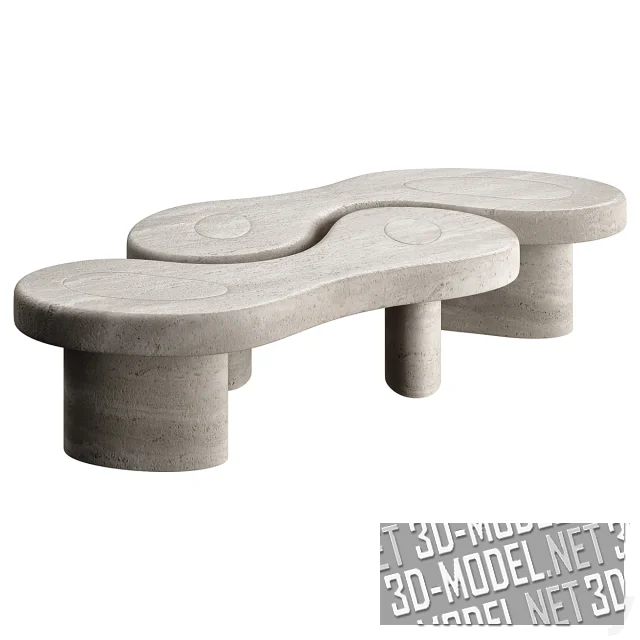 Двойной современный криволинейный кофейный стол из белого травертина, U&ME TRAVERTINE от Emma Donnersberg. Два отдельных массивных стола приставляются друг к другу, образуя общий фигурный элемент. Каждый из столов имеет две разновеликие массивные опоры овального сечения, вставленные в соответствующие сквозные отверстия в толстых столешницах. Стыки опор и столешницы образуют тонкие контуры овалов, являясь лаконичным декором на верхней плоскости стола. Пары столов представлены в двух размерах: 156,7х93,4х40см и 180,2х126,4х37,5см.