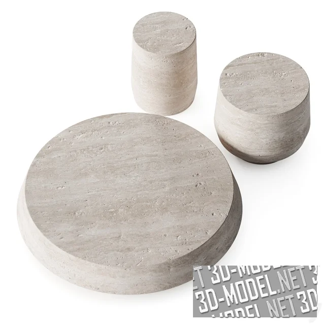Три массивных кофейных столика Timeless от Osminin Studio, сделанных из бело-бежевого травертина. Столы с круглой верхней плоскостью, разной формы тел вращения и разного габарита (d95/h20см, d30/h38см, d42/h37см,).