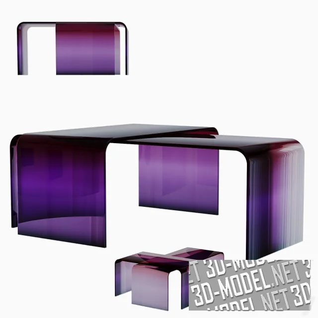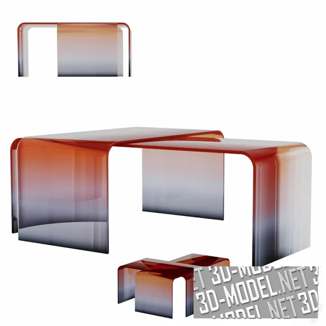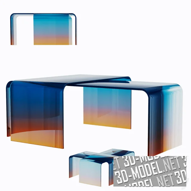 Современные П-образные кофейные столы из гнутого стекла с плавными цветовыми переходами («амбре», «деграде») - модели Gradient Glass от Germans Ermics. Модели составляют пару в одинаковых тонах, габариты которой позволяют «парковать» один стол под другим или создавать различные композиции (перекрестные и т.д.). Представлены следующие цветовые сочетания с плавными переходами: малиновый-голубой-прозрачный, черный-белый-оранжевый, оранжевый-синий, циановый-синий-малиновый-оранжевый, фиолетовый-темно-бордовый-прозрачный.