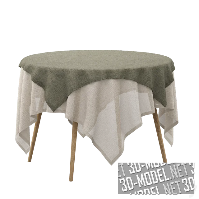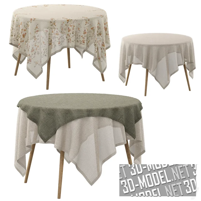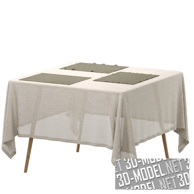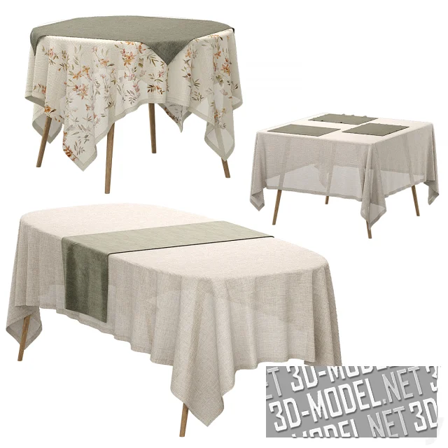Комплекты скатертей и салфеток из льняной ткани для обеденных столов. Деревянные столы представлены в четырех формах и размерах: круглый (d100см), квадратный (100х100см), овальный (200х90см), прямоугольный (200х90см). Скатерти сшиты из светлого льняного полотна. Один из вариантов скатерти (для круглого стола) декорирована принтом с изображением растений в серо-охристых тонах. Центр полотна при этом остается пустой, однотонной. Скатерти дополняют салфетки и подложки разных габаритов, из льняной ткани темного серо-зеленого оттенка.