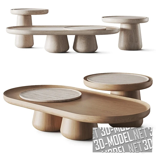 Круглые и овальные столики из светлого травертина и дерева - модели Bold от Mohdern. Подойдут в интерьер в скандинавском стиле, в стилях минимализм, эко, ваби-саби. Ножки напоминают ножки грибов-боровиков, со скругленными основаниями. Гладкие столешницы размещены асимметрично, относительно ножек. По кромкам столешниц изготовлены небольшие сглаженные бортики. Столешницы дополнены круглыми вставками «подносами». Габариты столов: 140х70х30см (овальный), d60/h41см, d50/h50см.