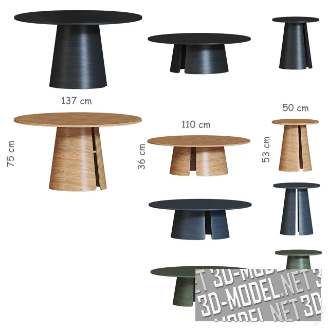Сопутствующий журнальный столик из той же коллекции имеет такой же дизайн и сдержанные, качественные характеристики. Размеры: 110x110x36 см, 50x50x52 см. Цвет для столов предлагается в вариантах ясень, черный, зеленый, синий.