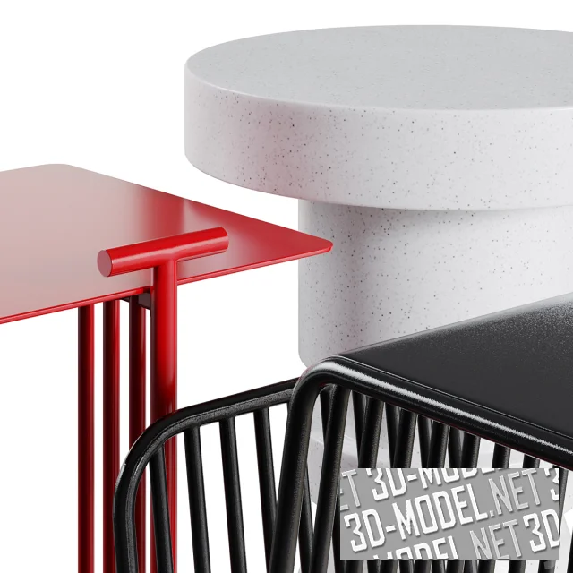 Второй столик - Cinera (61х32х48см), черного цвета. Имеет И-образную конструкцию, собранную из металлической решетки со сплошной квадратной столешницей. Третий стол Jairo Am.pm (d45см/h64см) выполнен из искусственного камня белого цвета. Круглая столешница и мощная центральная колонна опоры с конусообразным основанием сделаны единой деталью.