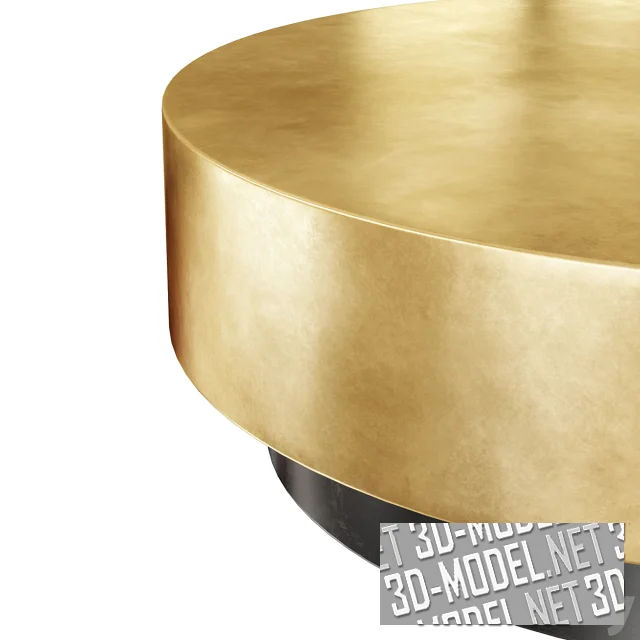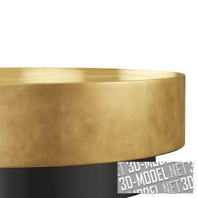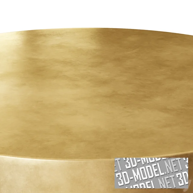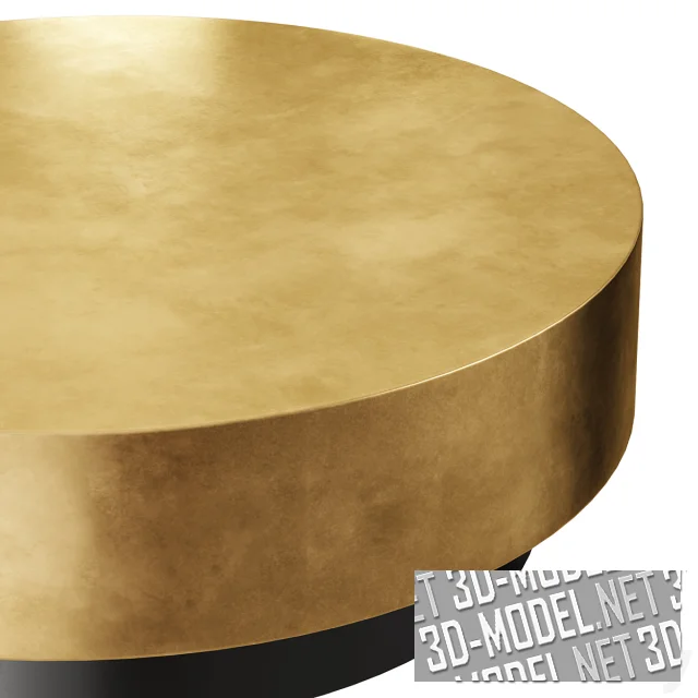 Современный низкий металлический кофейный столик-таблетка от West Elm. Конструкция состоит из толстой золотистой столешницы и черной круглой опоры меньшего диаметра. Габарит стола: d110см/h35см.