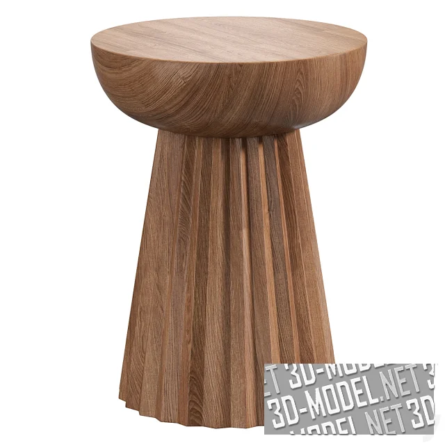Jose Manuel Ferrero). Толстая столешница выполнена в виде сплюснутой полусферы с массивной опорой. Опора, сужающаяся кверху, декорирована рельефом в виде плиссе. Габарит стола: d38/h48см. Отделка представлена в двух вариантах древесины: темно-серого и темно-бежевого.