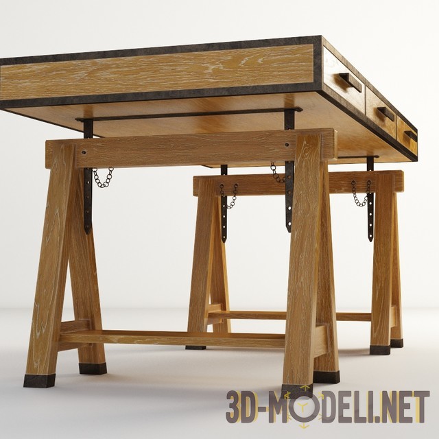 3D-модель прямоугольного стола производства Gramercy Home, SPRING STREET ADJUSTABLE, артикул MN2011. Ширина стола составляет 163 см, глубина 81 см. Высота может быть 76 см или 95 см, поскольку это стол-трансформер, и его столешница регулируется на два варианта. Стол деревянный, имеет универсальный дизайн и форму, позволяющую использовать его в качестве компьютерного, письменного и даже туалетного столика.