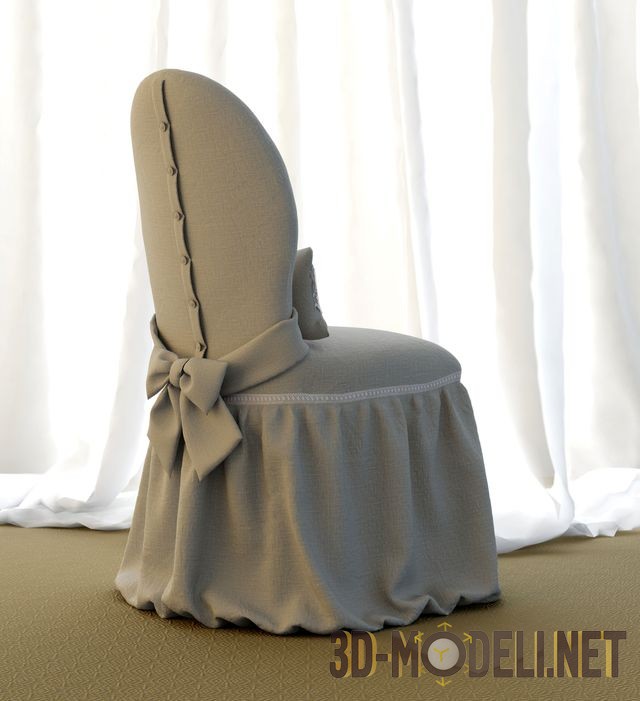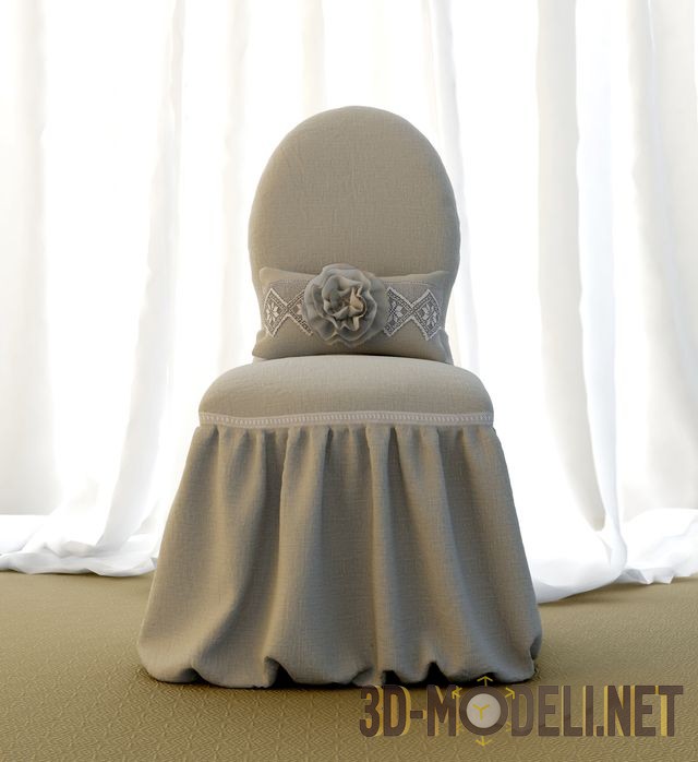 Красивый тканевый чехол серого цвета, предназначенный для декорирования стула. Чехол выполнен в классическом стиле, украшен небольшой плоской подушкой у основания спинки, декорированной кружевом и большим шифоновым цветком. Сзади на спинке чехол имеет ряд пуговиц. Такой стул будет органично смотреться в классическом интерьере и украсит собой любую гостиную или столовую.