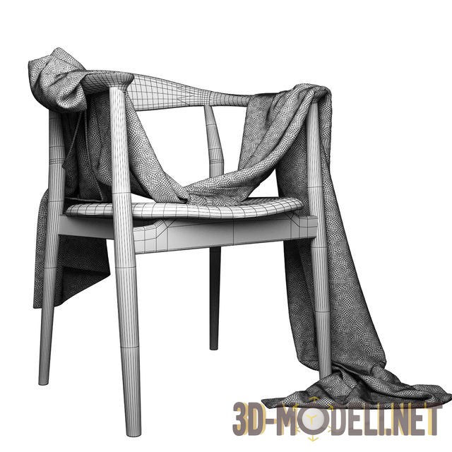 Деревянный стул с легким и ненавязчивым дизайном. Выполнен в винтажном стиле. Ножки сделаны выше сиденья и объединены деталью спинки. Дерево состарено. Сиденье из фанеры обтянуто серой тканью. На стул небрежно наброшено полотно в мелкую полоску. Стул хорошо впишется в различные интерьеры.