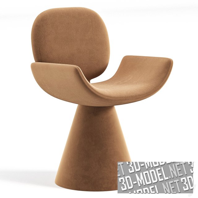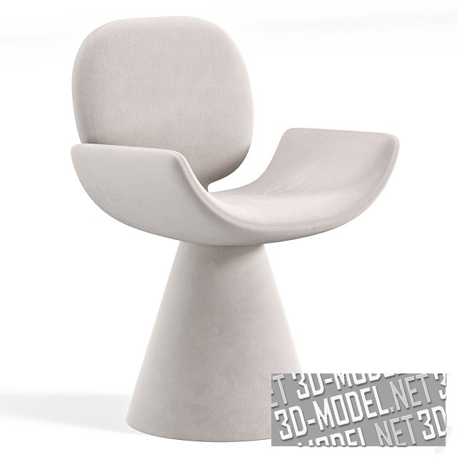 Farbice Berrux). Опора стула - массивный усеченный конус, на котором смонтировано мягкое изогнутое сиденье с приподнятыми боковыми гранями и спинка со скругленными углами. Обивкой покрыты все плоскости стула. Представлено три варианта обивки: белая, темно-серая и бежевая. Габарит стула: 58х82х55см.
