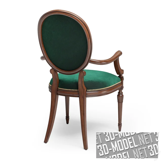 Деревянный резной стул Sevensedie Olga в классическом стиле, с овальной спинкой, фигурными точеными подлокотниками и обивкой из зеленого бархата. Деревянные элементы стула (ножки, рама, подлокотники) тонированы в орех. Периметры мягких вставок декорированы мебельными гвоздиками с золотистыми головками. Габарит стула: 103х59х62,5см.