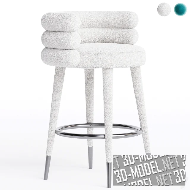 Визуально приятный и эргономичный современный барный стул Marshmallow от Royal Stranger. Круглое мягкое сиденье на изящных тонких ножках с металлическими наконечниками, бережно «окружено» огибающей невысокой спинкой. Спинка состоит из трех изогнутых цилиндрических валиков, закрепленных друг над другом. Металлическое кольцо-подставка для ног выполнена в цвет наконечников ножек. Представлены два варианта отделки стула: белое букле с хромированным металлом и бирюзовый велюр со светло-золотистым металлом. Габарит стула: 100х70х60см.